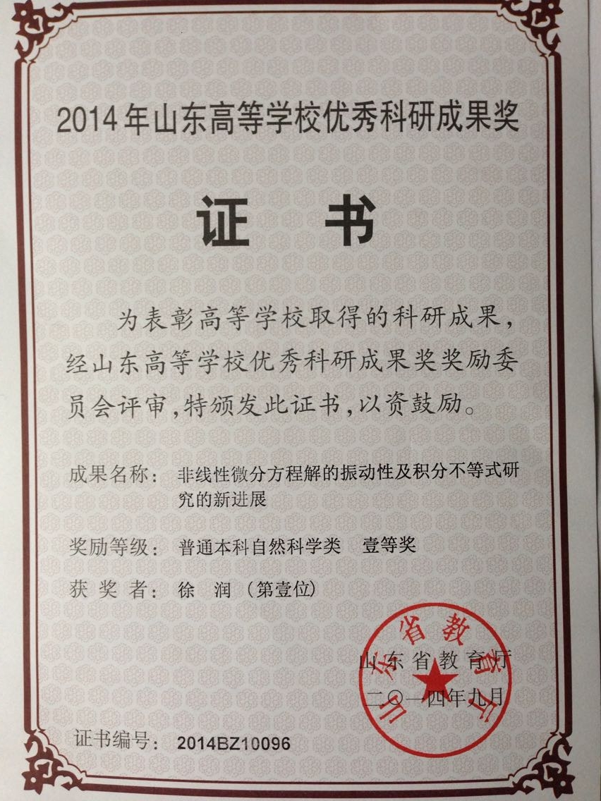 2014年9月徐润获山东省高等学校优秀科研成果奖自然科学类一等奖