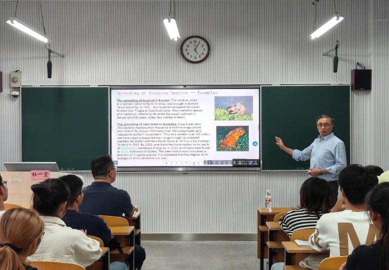 杜一宏院士以物种入侵为切入点,结合自己的最新研究成果,向同学们介绍了生物数学中几类关键数学模型的发展历史和了Logistic model,Lotka-Volterra model,Leslie matrix model和Holling 功能反应函数等重要生物数学模型中涉及到的数学知识,让同学们对该国际前沿研究领域有了初步但是较为全面的了解。随后杜一宏院士进一步介绍了自由边界问题与生物种群扩散之间的关联,充分阐释了数学在生物学和生态学研究中的重要作用。其间,杜一宏院士还与参会师生进行了热烈互动,就大家关心的学术问题进行了耐心解答并鼓励在座的同学们努力学习,为将来做从0到1的原创性数学研究奠定基础。