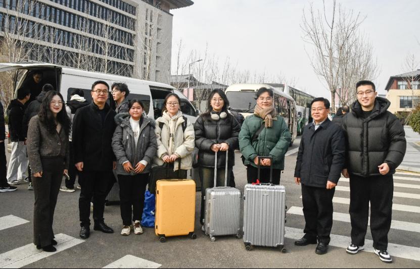 院长王培合,辅导员杜晨曦、吕瑞源共同为即将奔赴实习岗位的学子送行。