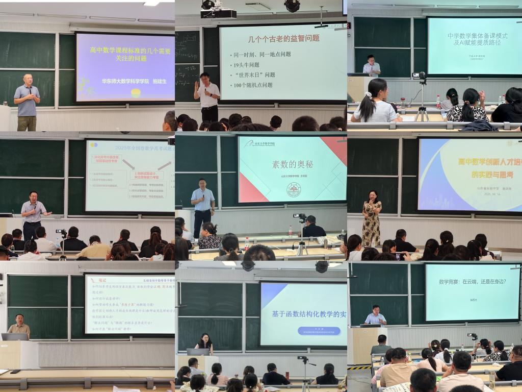 本次培训为期六天,依托学校数学学科优势,创新采用初、高中分组授课模式,实现学段精准覆盖。培训邀请人民教育出版社张劲松编审、华东师范大学鲍建生教授、宁波大学邵光华教授、山东大学王明强教授,青岛教科院李现勇教授等国内数学教育界权威专家,与学院师资团队协同授课。围绕“教材与课标解读”“核心素养与课程改革”“信息化手段赋能数学教学”“命题技术与评价体系构建”“竞赛数学辅导策略”“教研论文撰写方法”等专题,开展系列讲座。课程内容体系完整,兼具理论深度与实践指导性,为参训教师提供了从教育理念到课堂方法的全方位赋能。