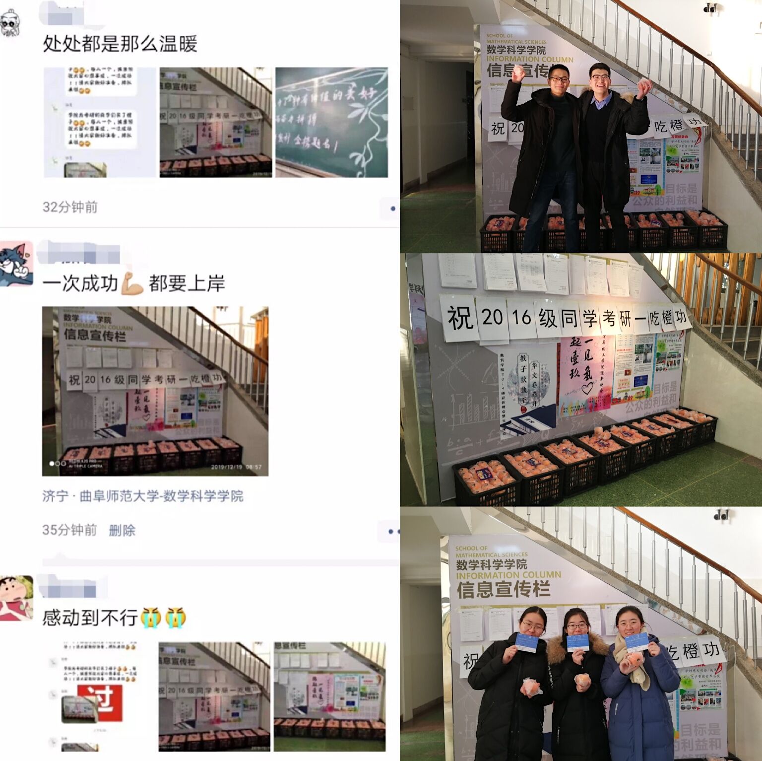 据悉,为帮助同学们缓解考前的紧张心情、鼓励同学们积极自信参加考试,学院党委副书记曲凤东一大早就前往水果批发市场为同学们采购橙子,寓意心想事成,一次成功。橙子到达学院后,同学们欢呼雀跃,纷纷发QQ、朋友圈、微博赞叹“太暖心”“爱我数科院”“一定成功”!20日上午,数学科学学院辅导员老师前往学生乘车集中点,为他们打气加油。
