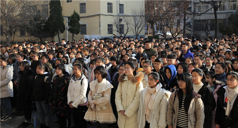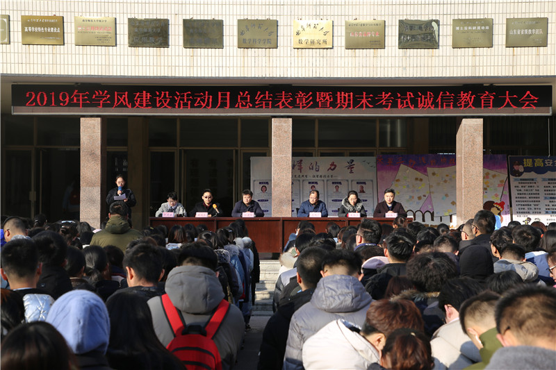 2019年学风建设活动月总结表彰暨期末考试诚信教育大会在数学楼前隆重举行。学院党委书记刘建新、党委副书记曲凤东、副院长王利广、团委书记朱伟卫、辅导员杜晨曦、徐腾飞出席了此次会议,学院部分同学参加了大会。