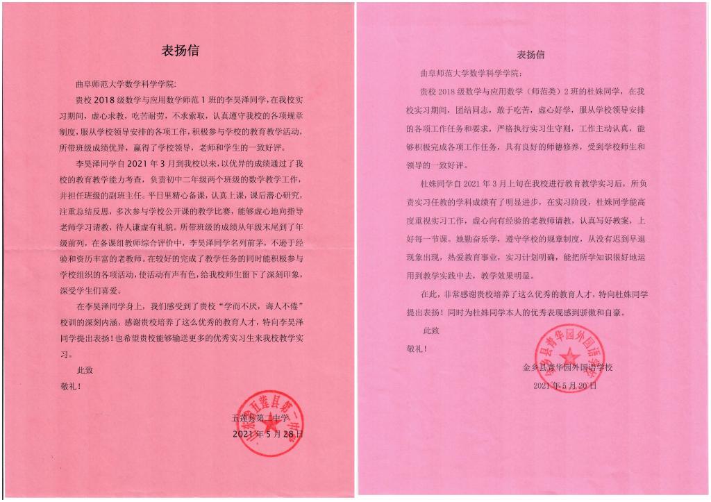 能够输送更多优秀实习生到实习学校教学实习。其中,五莲县第二中学、金乡县青华园外国语学校寄来了感谢信,分别对在该校实习的李昊泽、杜姝同学提出了高度表扬。