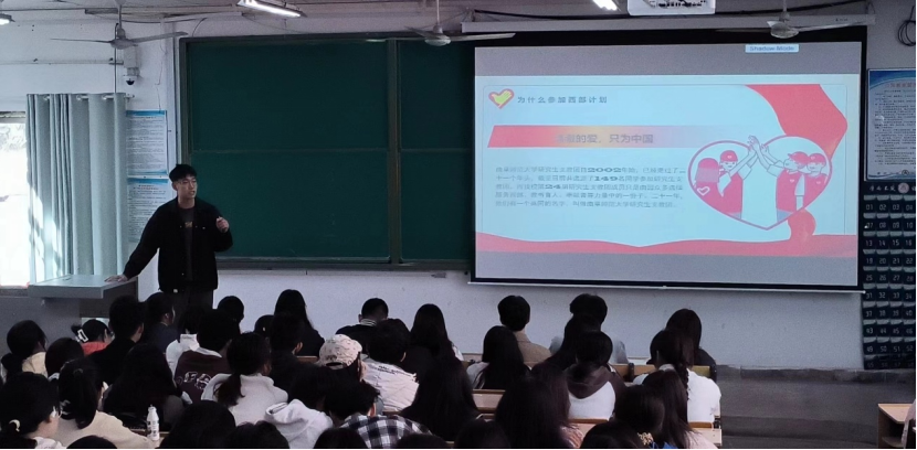 李泳儒主要从走近西部、走向西部、走入西部三个方面,对西部计划支教活动展开宣讲。宣讲中,李泳儒结合自身和团队丰富的支教经历,呼吁同学们积极参与西部计划志愿服务,为祖国西部教育事业贡献力量,提升个人价值,促进社会进步。活动中,同学们被温情感动,被力量鼓舞,纷纷表示想要尽其所能、传递爱心。