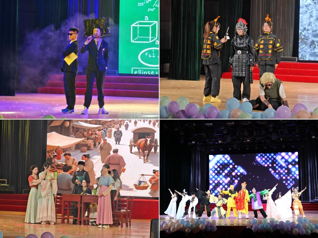 展演现场,传统文化组以秦汉深衣、唐制襦裙、民国长衫等服饰系统展现中华衣冠文明;创意组以"哪吒智破数学山""教室协奏曲"等原创剧本,配合环保材料制作的创意服饰呈现青年学子的奇思妙想;数学元素组则创新采用概念拟人化手法,通过"数字宝宝”等角色扮演,配合数学史情景剧生动演绎学科发展脉络。