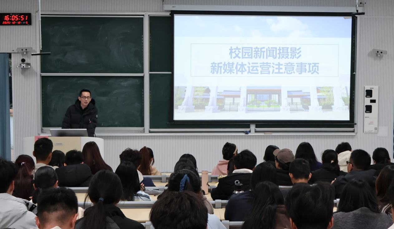 刘萌结合新闻宣传工作的实际需求,从前期准备、拍摄内容到后期处理,全面讲解了校园新闻摄影的核心要点。他为青马班的学员们讲述了新闻图片的拍摄要领,并以实际案例从构图结构、拍摄角度、拍摄对象等方面向同学们讲解了新闻图片的拍摄技术以及注意事项。他以典礼、讲座等场景为例,拆解了常见活动的拍摄技巧,还分享了花絮抓拍、文体活动瞬间捕捉技巧及Lightroom等软件的修图方法。他强调新媒体运营要坚守政治底线、细校内容、坚持原创,让宣传作品兼具美感与深度。