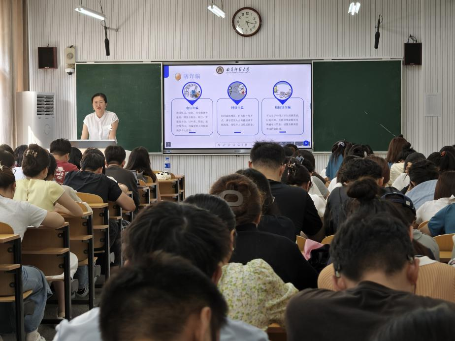 本次班会涵盖了防溺水、防诈骗、防艾防毒、防范自然灾害、用电安全、交通安全、网络安全、消防安全八大主题。会上,韩琳琳老师依托典型案例剖析与情景模拟教学等方式,对“六不准”防溺水原则、诈骗犯罪链条拆解、艾滋病的传播途径与预防措施、“拒绝毒品诱惑”五大原则、台风地震应对策略等一系列安全知识与技能展开了详细讲解。在教学过程中,她聚焦宿舍违规用电等高频隐患强化风险认知,并着重强调了“不轻信、不泄露、不转账”的“三不”原则,呼吁学生以“警惕预判+科学应对”的思维模式筑牢安全防线。整场班会以“知识传导—意识强化”为教学逻辑主线,为师生搭建起覆盖暑期全场景的安全防护网络。