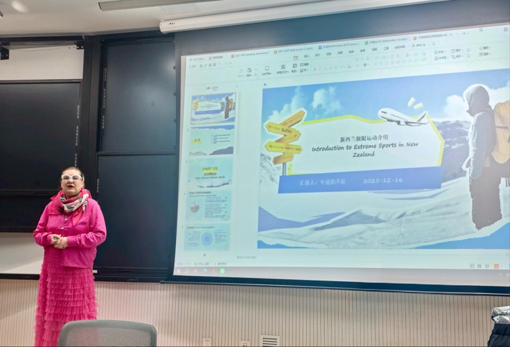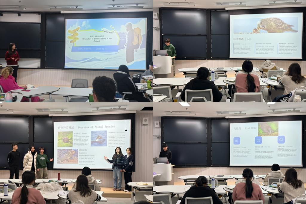 在汇报展环节,各班级学生自由组队,围绕新西兰极限运动、珍稀动物及饮食文化等主题,精心制作并展示了中英双语PPT。参赛队伍以生动的双语讲解展现了独特的创意与深度的内容,评委老师从多维度对选手表现进行了综合考评。