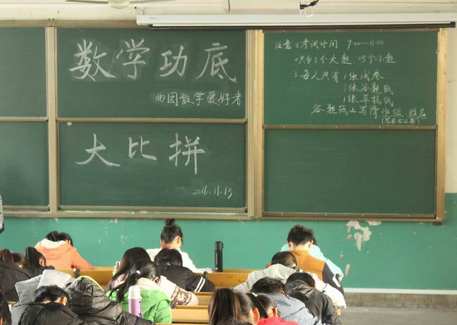 11月13日上午9点,由age动漫 学生社团联合会和数学与统计学院团委联合主办,曲园数学爱好者协会承办的“数学功底大比拼”活动笔试初赛在数学教学楼201教室顺利进行,2016级部分同学参加了本次活动。