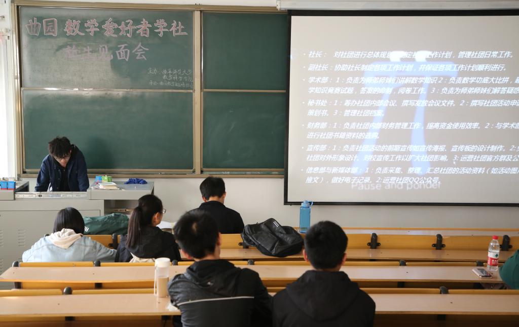 团委主办,曲园数学爱好者承办的数学爱好者学社新生见面会,于数学教学楼201教室成功举办,数学爱好者学社全体成员参加此次会议,数学爱好者学社社长许书晨主持本次会议。
