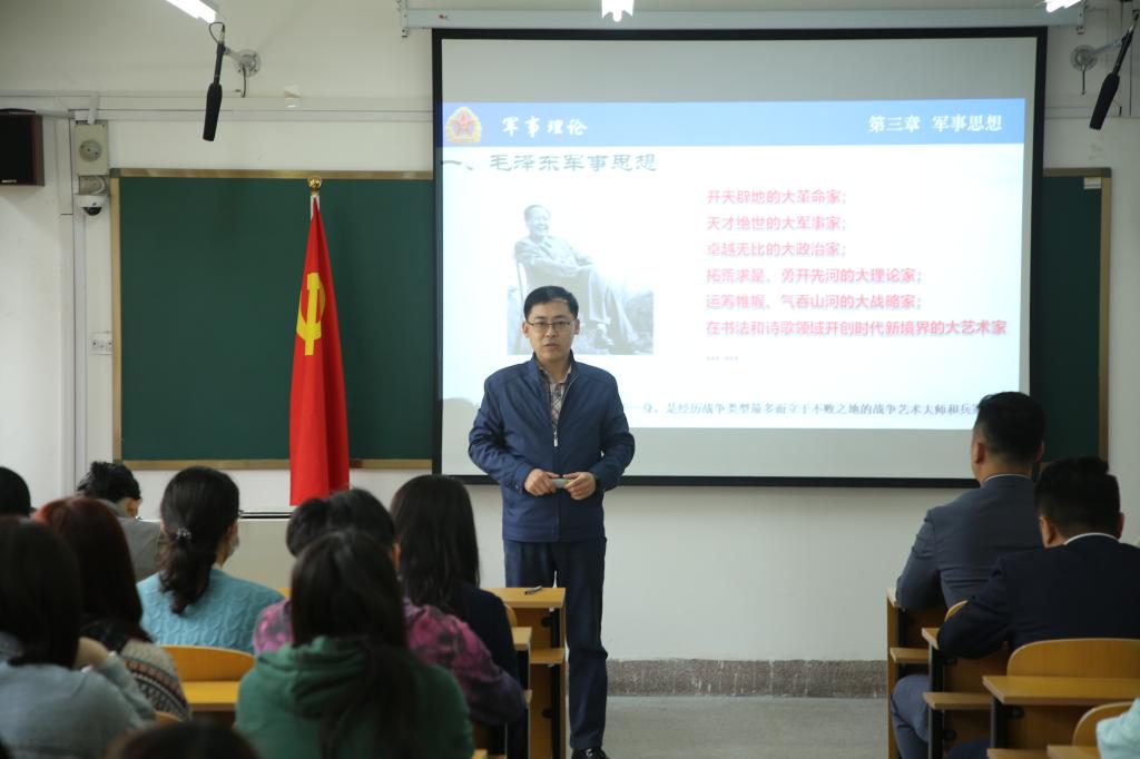 会后,党委副书记曲凤东为本科生党支部上党课。他从多个方面解释了毛泽东军事思想的科学含义,详细地解释了毛泽东军事思想的形成与发展,并重点围绕毛泽东军事思想的基本内涵和本质特征做出了详细的解读。他指出,在革命和建设长期实践中,以毛泽东同志为主要代表的中国共产党人,根据马克思列宁主义基本原理,形成了适合中国情况的科学指导思想,这就是毛泽东思想。在当今时代,毛泽东军事思想仍有重要的指导意义,要坚持和运用好毛泽东思想活的灵魂。
