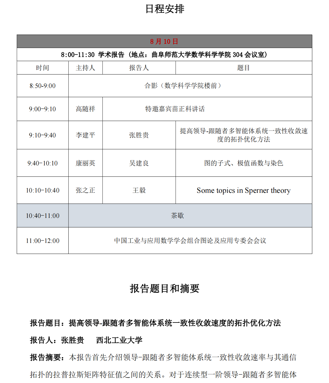 【8月10日】中国工业与应用数学学会图论组合及应用专业委员会主任会议日程安排