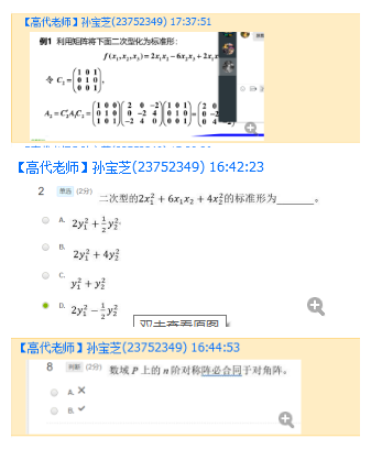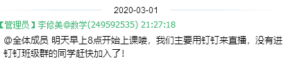 (1)开课前准备:线上课程选用MOOC课资源安阳师范学院的《高等代数》课程,如图1所示,这让学生2月16日就已经进入课堂跟班学习在线课程,利用上学期就已经建好的QQ群在线与学生互动了解和检查学生跟班学习的情况和效果,如图1’所示。通过摸索及调研比较雨课堂、钉钉等直播特点,并结合数学专业课本身的特点,最终选中钉钉作为直播教学的主要工具,并建立钉钉班级群,如图2所示。